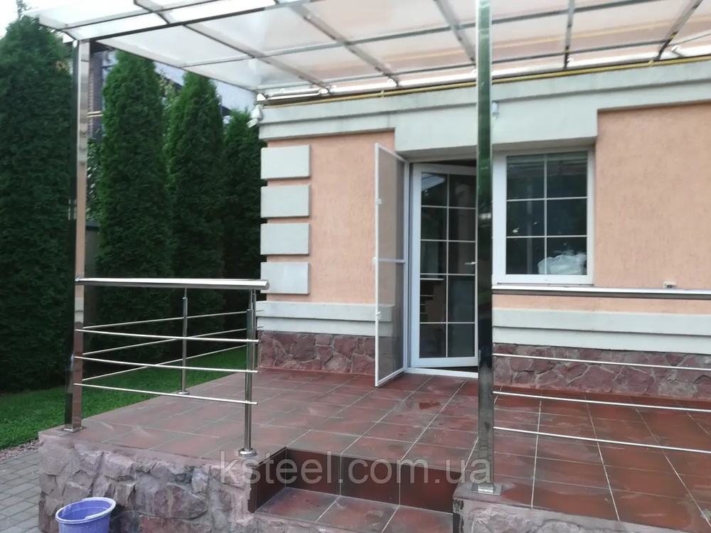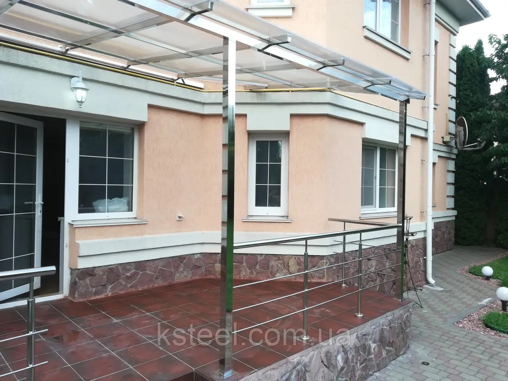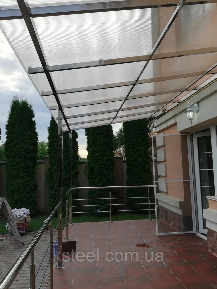 Основне застосування односхилих навісів - тераси, стоянки, балкони, зона відпочинку і т д. Перевага використання нержавіючої сталі тривалий термін експлуатації, відсутність корозії. Можливо зашити одну або кілька стін. Зварна конструкція.