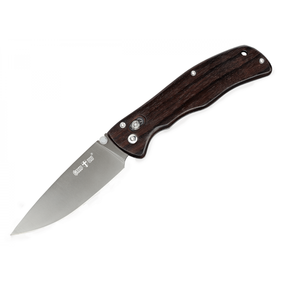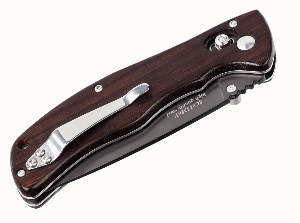 Прочному складному ножу нужен надежный замок – это осевой замок «Axis Lock». Мощный стальной стержень уверенно запирает клинок в открытом положении, а тугие омегаобразные пружины обеспечивают надежную фиксацию. Накладки на рукояти изготовлены из красивого и прочного черного дерева. Черное дерево является очень плотным материалом и имеет высокие механические свойства. Древесина, используемая для изготовления накладок, прошла специальную обработку и устойчива к влаге, гниению и вредителям. Теплые на морозе и приятные на ощупь накладки отлично гармонируют с темным клинком. Шпеньки на клинке обеспечивают открытие ножа одной рукой, а симметричный дизайн будет одинаково удобен и правшам и левшам. Наличие клипсы обеспечивает удобное постоянное ношение ножа с собой.