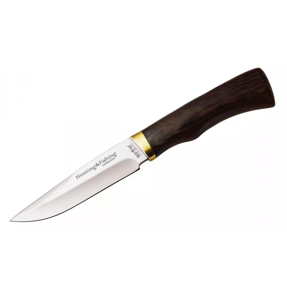 Рукоять ножа исполнена из древесины венге, обработанной пропиткой, после которой ей не страшная влага. Место сопряжения клинка и рукоятки укреплено и защищено красивым латунным больстером. Имеется у рукояти и удобная подпальцевая выемка, да и в целом она обладает продуманностью форм. Также в комплекте к ножу идут ножны из натуральной кожи.