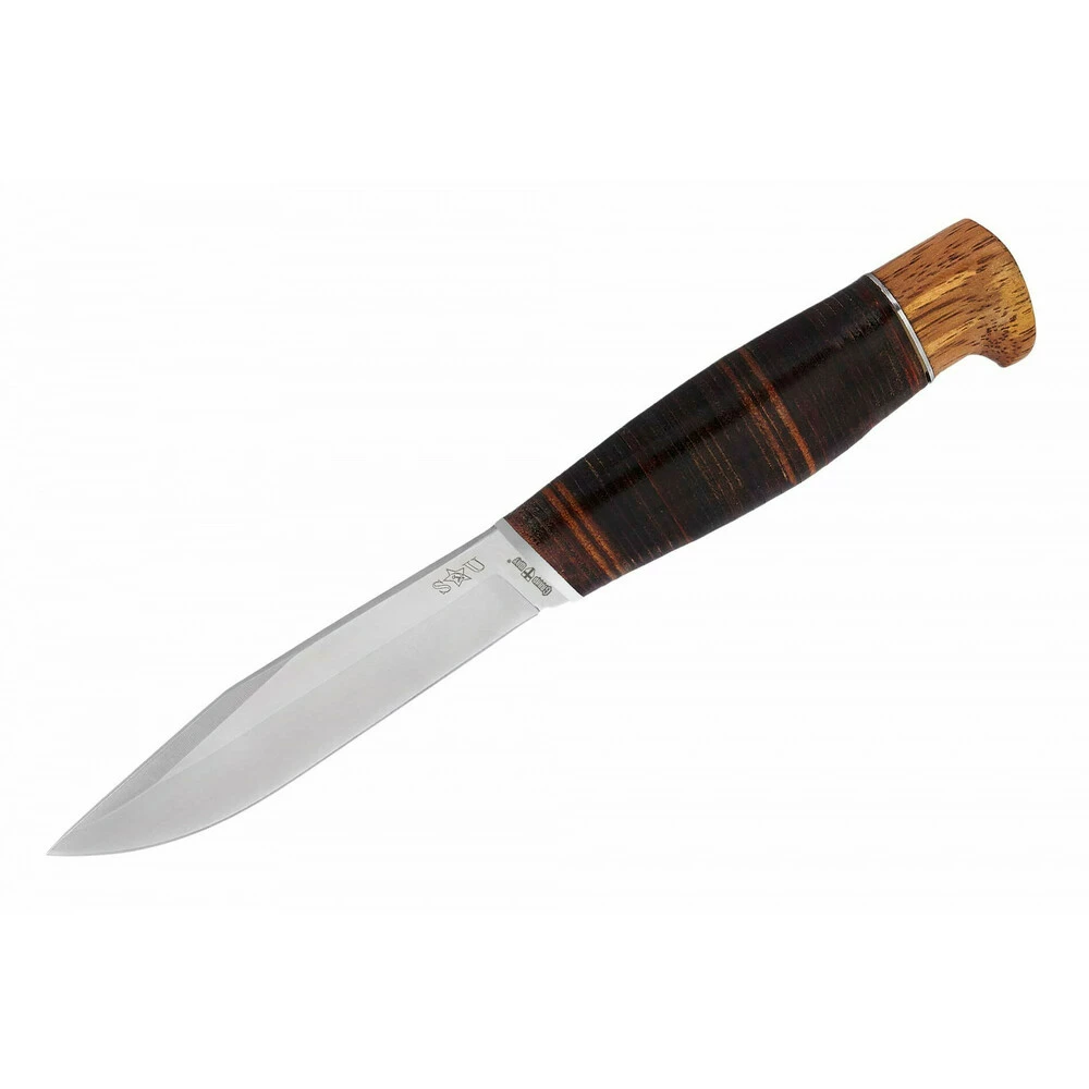 Рукоять ножа 2565 L – это сочетание дерева и наборной кожи, она не холодит руку и хорошо лежит в руке. Дополнительно, рукоять усиленна и укреплена стальным больстером. А тыльник имеет загиб - «клюв», характерный для финских ножей, предохраняющий нож от выскальзывания из ладони, и улучшающий хват в целом.
