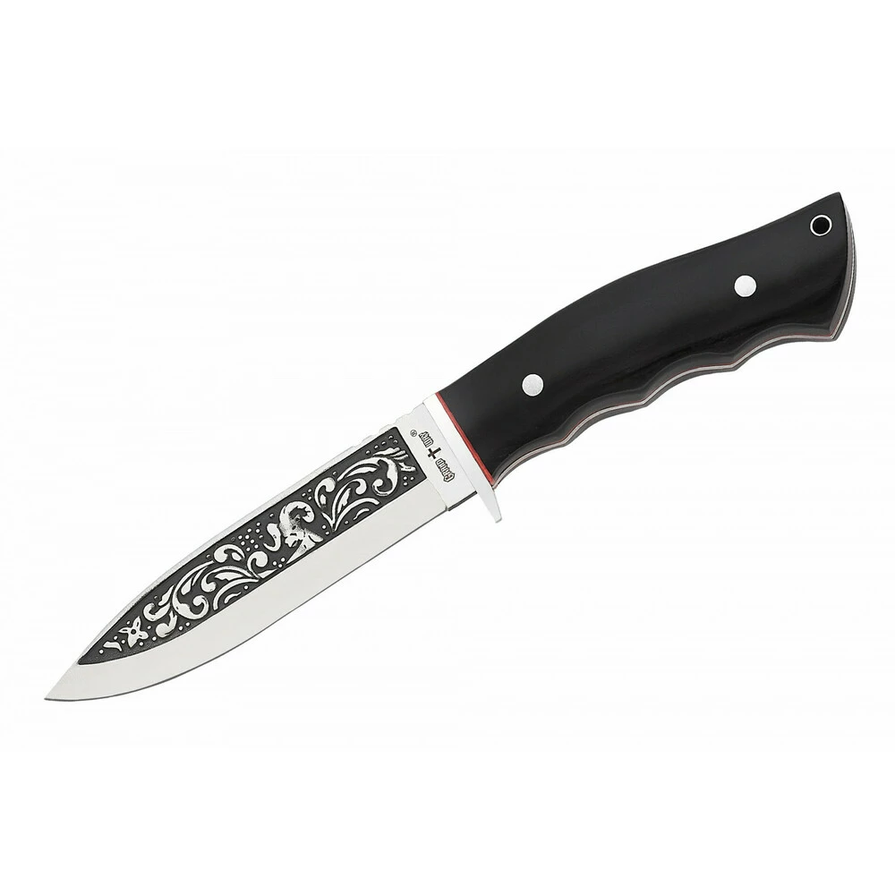 Притягательность ножа во многом оределяется идеальными пропорциями и прекрасными материалами, примененными в данном ноже. Темный палисандр прекрасно сочетается с полированной сталью, а вставки из рога создают свой определенный шарм. Голомень клинка украшена стильным изображением оленя на фоне двух охотничьих ружей.