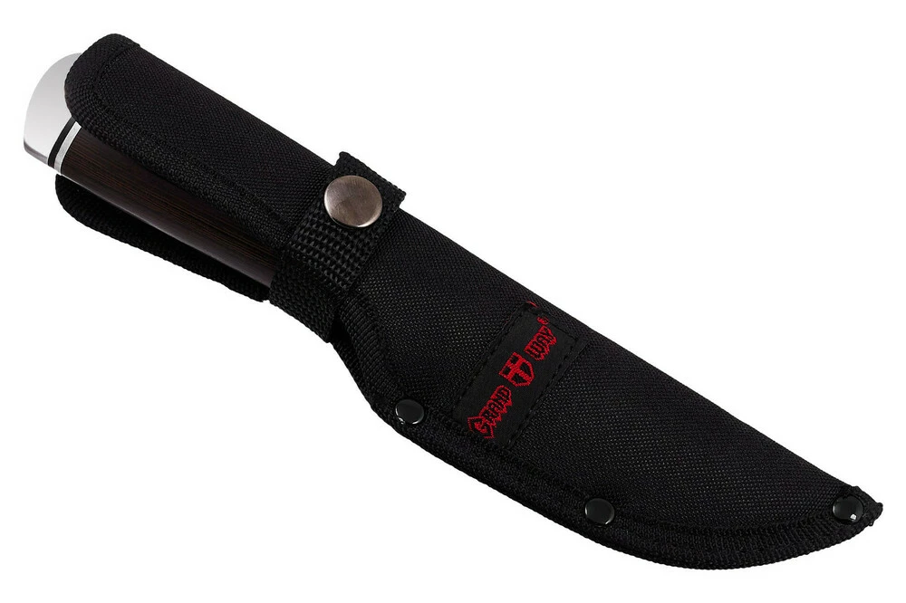 Нож охотничий фиксированный Grand Way FB 251 – это охотничье-походный нож с клинком trailing point и  деревянной рукояткой, имеющей металлическое навершие. У трейлинг поинт острие характерно задрано, относительно клинка от обуха. Такая особенность позволяет клинку лучше резать твердые материалы – шкуры, кожу, ткани. Протыкать что-либо таким клинком, при этом, совсем неудобно. Кстати, эта сниженная «протыкаемость» сразу переводит ножи с таким изгибом в категорию не холодного оружия.
