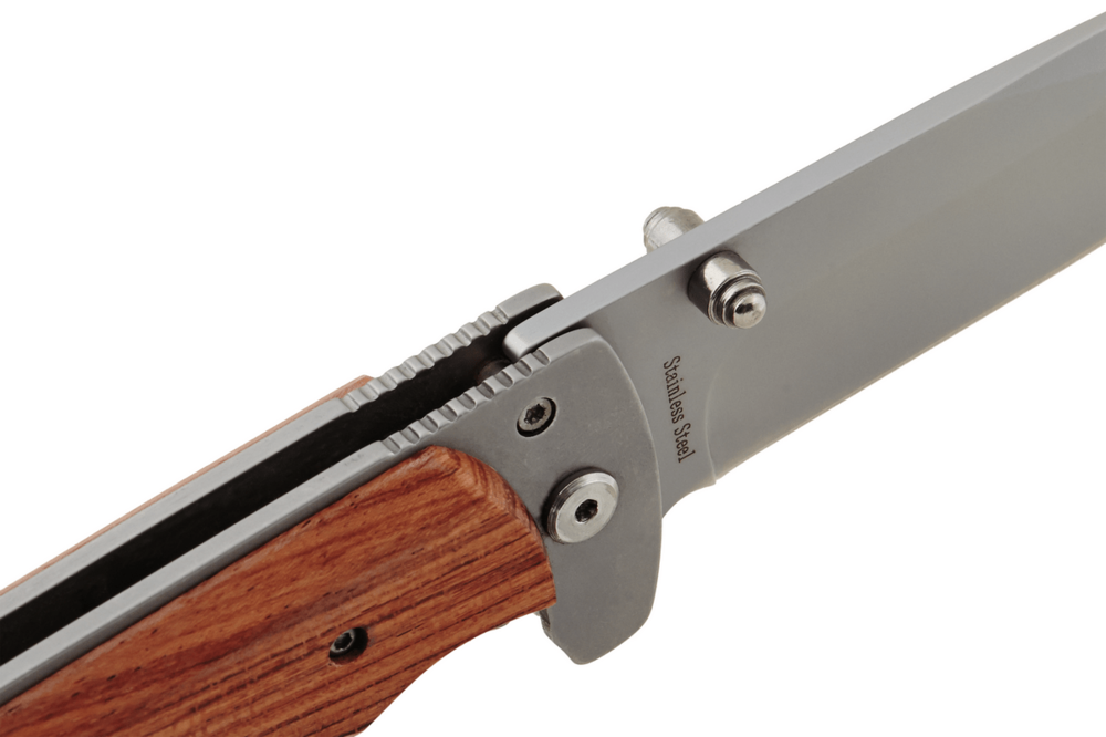 Клинок этого фолдера сделан из нержавеющей 420 стали, имеет длину 89 миллиметров и твердость 52-55 единиц по Роквеллу. Также клинок снабжен небольшим фальшьлезвием. Значительная толщина в обухе – 3,31 миллиметра, вселяет в нас чувство уверенности.