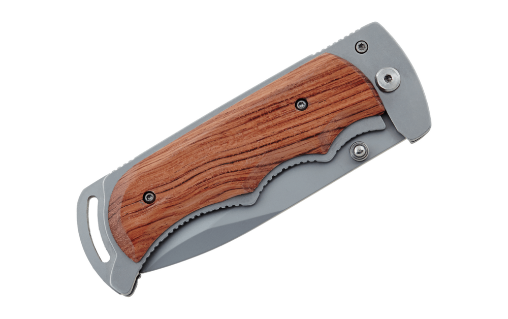 Накладки на металлической рукояти – деревянные, с ними нож не холодит руку, удобен для удержания и не скользит в руках.