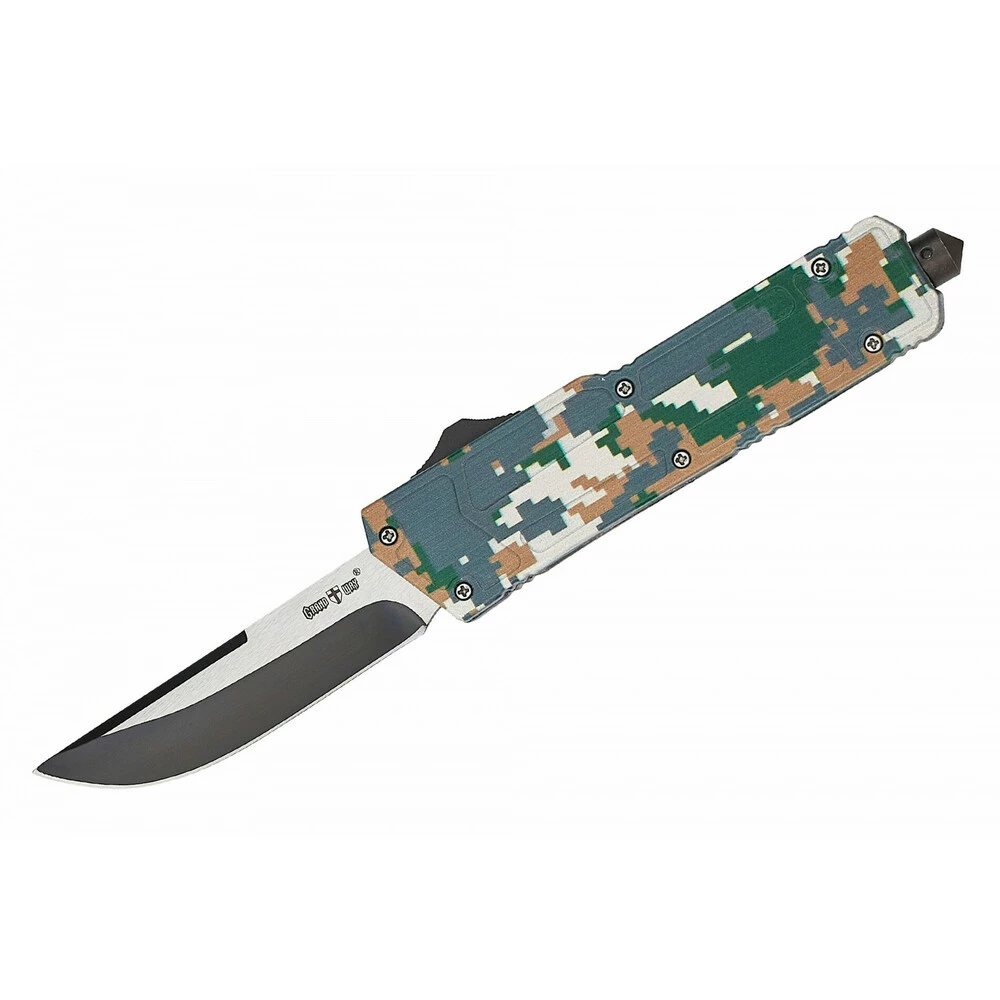 Нож Выкидной  Grand Way 9182 BCV оснащён механизмом двухоперационного типа (Out The Front Double Auto). Иными словами, смещённый вперёд слайдер вызыват выброс клинка вперёд, смещённый назад – убирает клинок обратно в рукоять.