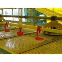 Кліткове обладнання для вирощування курчат-бройлерів - ТББ - обєднало в собі два способи вирощування - клітинне і підлогове утримання птиці. Поєднання цих двох методів утримання дало можливість створити ідеальні умови для вирощування бройлерів. Кліткове обладнання ТББ - прекрасна альтернатива підлогового обладнання птиці. Переваги бройлерною клітини забезпечують більш легку і якісну організацію роботи і, як результат, більш високий прибуток, тому що: • не потрібно підстилка на підлогу; • економляться витрати на створення температурного режиму на одиницю продукції в декілька разів; • зниження використання ветеринарних препаратів у декілька разів; • поліпшуються показники зростання; • конверсія корму краще; • період зростання бройлерів коротким; • використання 1м2 підлоги збільшується у декілька разів. ◊ Новий технологічний підхід до вирощування курчат-бройлерів. ◊ У конструкції закладений триразовий запас міцності. ◊ Можливість використовувати корми з великим відсотком жирності. 1. Оптимальні умови утримання птиці: • У клітці птах ізольована від контакту з підстилкою, яка є живильним середовищем для мікробів. Кал не затримується на клітинному полики, тому немає небезпеки зараження стада. • У клітці ТББ встановлені годівниці тарілковий типу, які застосовуються при підлоговому вирощуванні птиці. Дане нововведення дозволило істотно збільшити фронт годівлі птиці. • У клітці ТББ встановлені ніпеля з збільшеною пропускною здатністю, що дає можливість птахові отримувати воду в достатній кількості, а мікрочашкі виключають виключають проблеми зневоднення птиці в добовому віці. • Лінії системи напування і системи годівлі регулюються по висоті, що дозволяє забезпечувати вільний доступ у відповідності з віком птиці регулювати кількість споживання води та корму, також можна регулювати обсяг корму в годівниці в міру зростання бройлера. • Використання сітчастої перегородки створює сприятливий мікроклімат у пташнику, і це дозволяє ефективніше експлуатувати поголівя. 2. Довговічність: • Клітинна обладнання виготовлене з високоякісної оцинкованої сітки. • Застосовуються посилені несучі стійки. • У конструкції передбачений великий запас міцності. • У приводах застосовані сталеві розжарені шестерні. • Оцинковані кріпильні зєднання з пружинними шайбами. 3. Низькі експлуатаційні витрати. • Щільність посадки птиці дозволяє економити витрати на підтримку температурного режиму в порівнянні з підлоговим вирощуванням у декілька разів; • Розроблена система планово-попереджувальних ремонтів знижує навантаження на слюсарів. • У комплект поставляється великий запас матеріалів ЗІП в компактній і зручній упаковці. ТББ-А - клітка для вирощування курчат-бройлерів з автоматичним вивантаженням птиці У клітинному обладнанні ТББ-А використовується спеціальна система підлог. Він складається з шести висувних частин, рух яких здійснюється по напрямних з оцинкованої сталі. Напрямні підтримують гр
