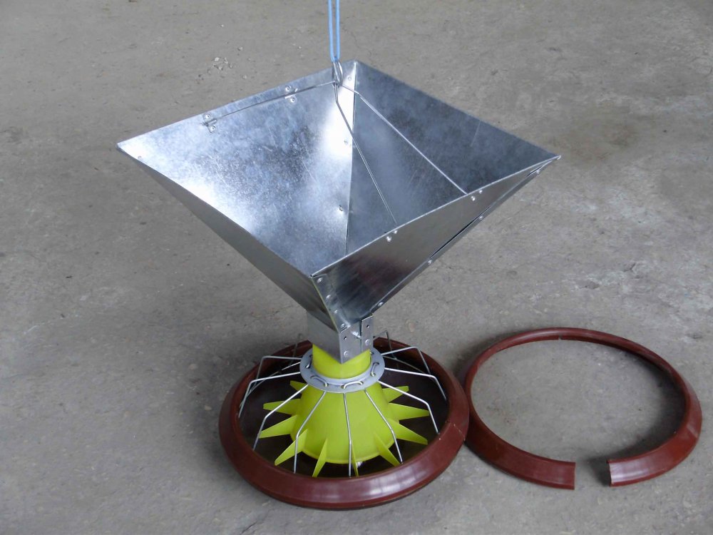 При выращивании цыплят с 1-го до 7-ми дней на поддон кольцо не устанавливается, чем обеспечивается свободный доступ цыплят к корму. После 7-ми дней на поддон устанавливается кольцо, исключающее потери корма при склеивании.