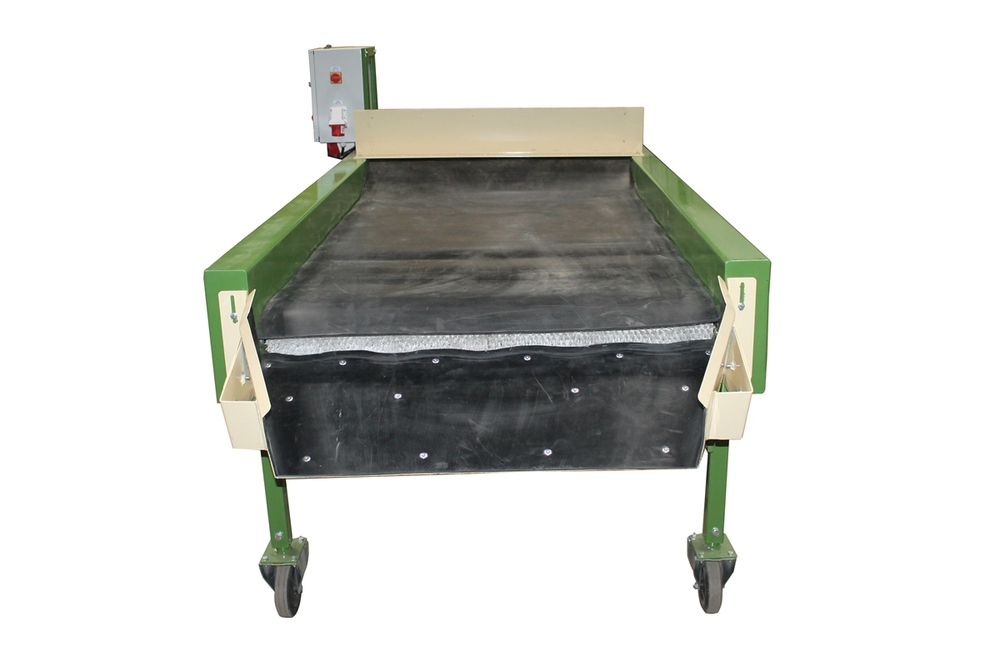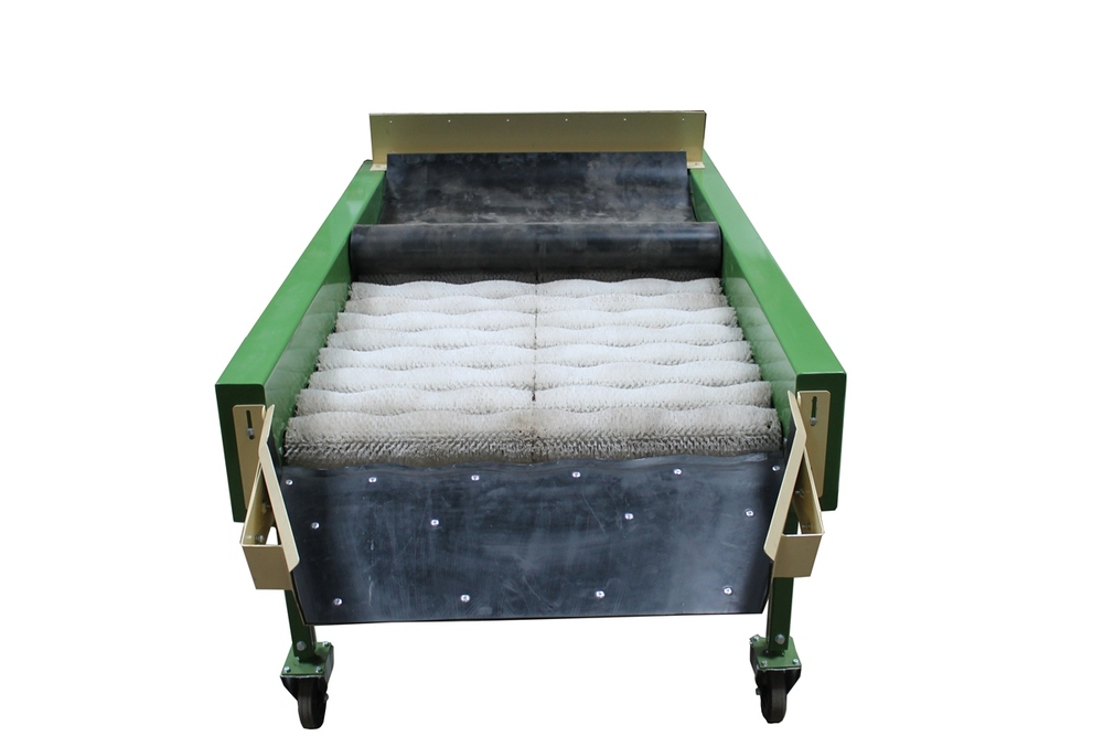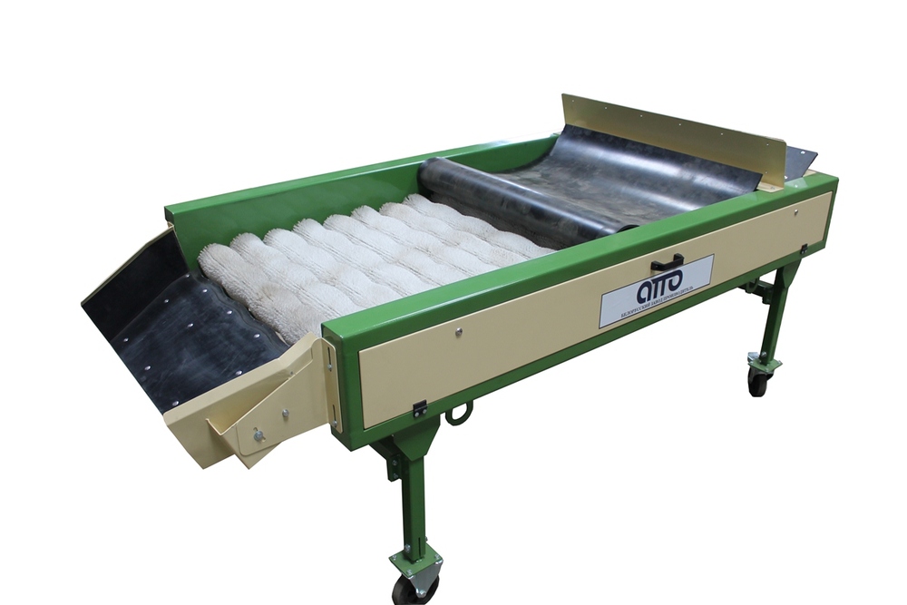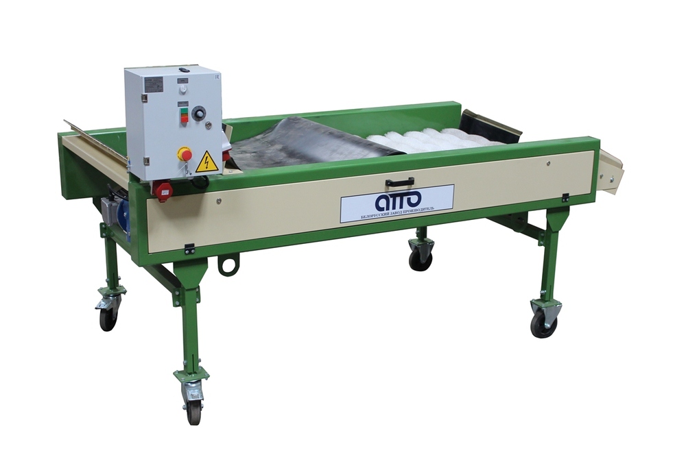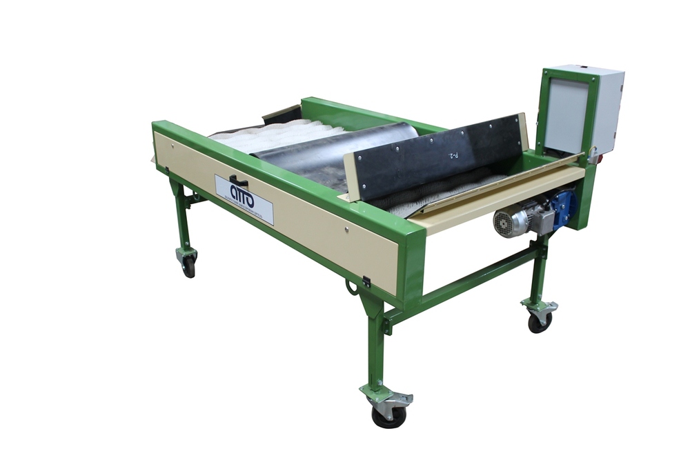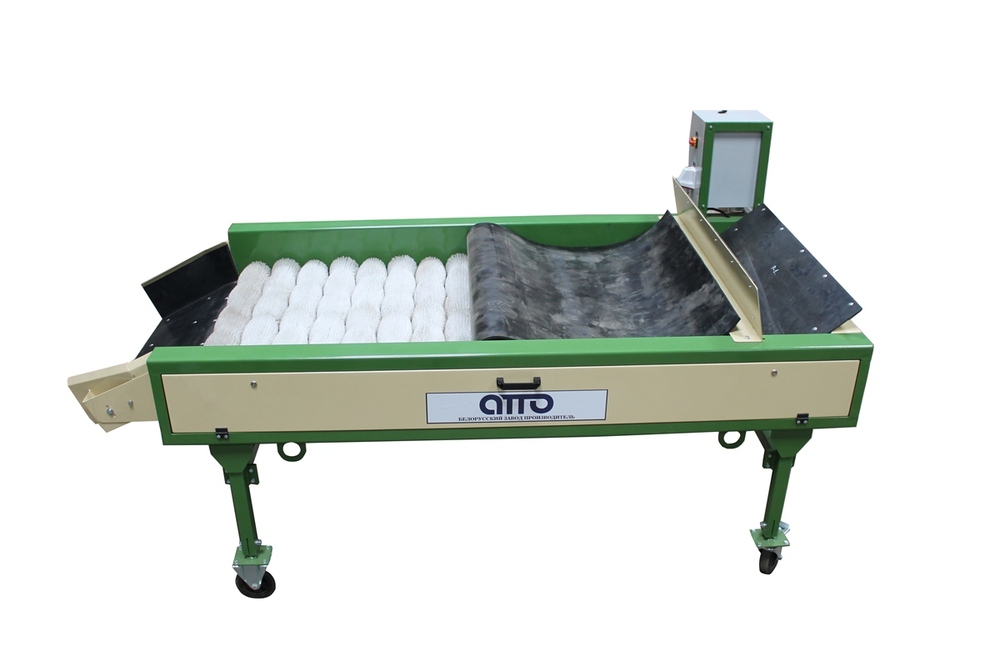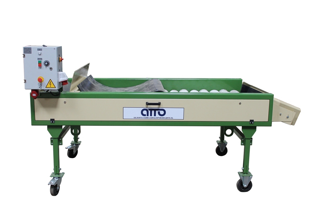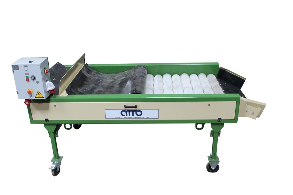 оборудование машина для сухой очистки чистки картофеля и овощей УСО-10 (сухая очистка чистка картофеля и овощей) - предназначена для очистки овощей (более щадящей чем мойка) от земли, чернозема, грязи, песка, глины. Машина cухой очистки придает товарный вид таким продуктам как: картофель, морковь, свекла, а также лука от отшелушивающейся кожуры. Овощи вручную или автоматически с помощью лотка или Приемного бункера КЛП-1 подаются на вращающиеся круглые (волнообразные) полиамидные щётки, где очищаются и, с помощью сетка-держателя поступают в упаковочную тару или поступают с помощью выгрузного лотка на инспекционный конвейер (сортировочно-переборочный стол). На Установке Сухой очистки установлен частотный преобразователь для регулировки скорости движения щеток (он установлен для того чтобы предохранить травму при очищении продукта щетками). Очистка овощей предохраняет их от гниения при длительном хранении и придаёт им товарный вид перед реализацией. Установка сухой очистки имеет максимальное количество щеток-16шт. Установка сухой очистки изготавливается в двух вариантах: 1. С сетка-держателями на 4 сетки, 2. С выгрузным лотком. Как дополнительная опция на машине сухой очистке может устанавливаться пылеулавливатель (отсос пыли-грязи в мешки).
