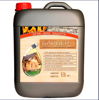 Барьер-1 - 100% натуральное средство для комплексной защиты древесины от воспламенения, горения, распространения пламени, а также гниения, плесени и синевы внутри помещений и на открытом воздухе (под навесом) в условиях ограниченного контакта с грунтом и умеренного воздействия атмосферных осадков. Создано по технологии ECOSTAR - инновационная технология производства натуральных безопасных пропиток для древесины нового поколения. Обработка средством Барьер-1 обеспечивает трудногорючесть и трудновоспламеняемость древесины, уменьшает токсичность продуктов горения. Барьер-1 – готовый к применению водный раствор природных минеральных компонентов. Огнебиозащита Барьер-1 впитывается в древесину, образуя в ней насыщенный активными компонентами защитный слой, препятствующий воспламенению, горению древесины, распространению пламени, а также подавляющий развитие плесневых, деревоокрашивающих и дереворазрушающих грибов. Барьер-1 применяют для обработки новых и ранее обработанных антипиреном или антисептиком деревянных стропил, балок, обрешеток, перекрытий, обшивок, перегородок, стен и других пиленых, строганных, бревенчатых элементов конструкций жилищного, общественного, производственного и сельскохозяйственного назначения. - Сертифицированный Державним ценром сертифікації МНС України - Готовый раствор - Срок защиты: до 5 лет (огнезащита), до 10 лет (биозащита) - Расход: 2 группа – 0,25л/м2, 1 группа – 0,5л/м2 - Фасовка: пластиковая канистра 10 л. и 5л.