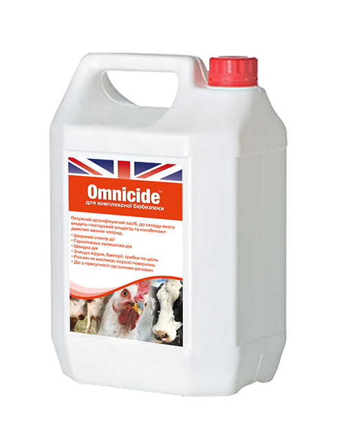 Омницид - это уникальный продукт для наружной дезинфекции широчайшего спектра действия. Который полностью исключает бактерии, вирусы и грибки на обработанном пространстве. Препарат, сочетающий в себе ингредиенты с мощнейшим действием уничтожающим все болезнетворные микроорганизмы.  Применяется для обработки  ферм, инкубаториях и транспортных средств.