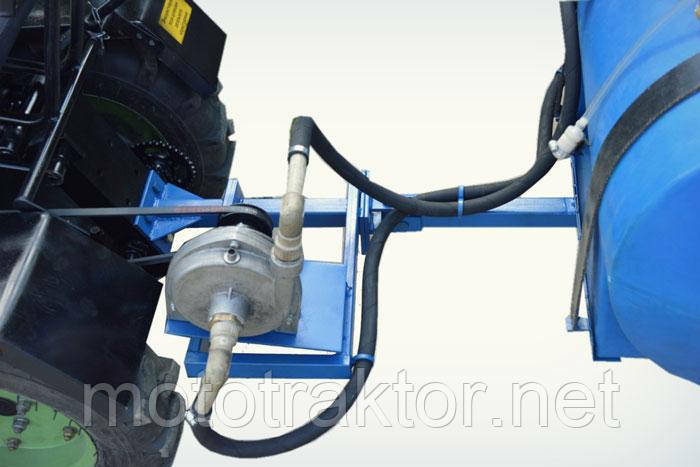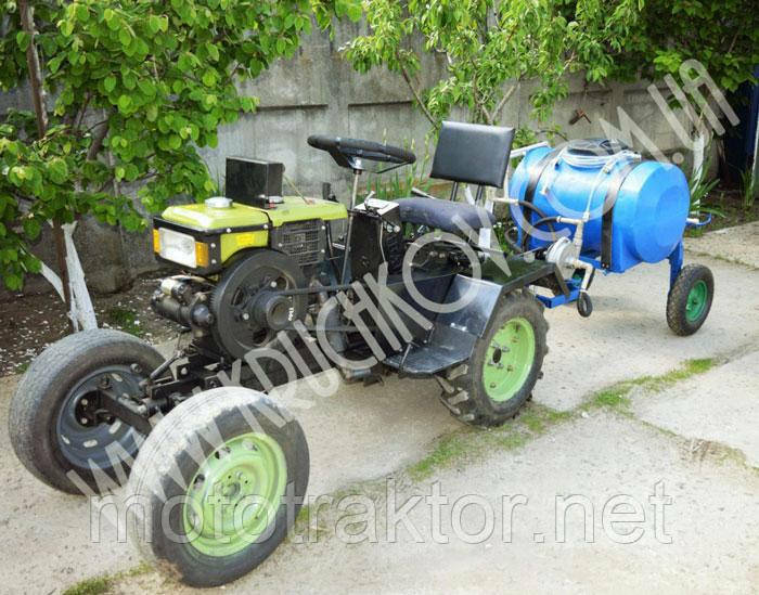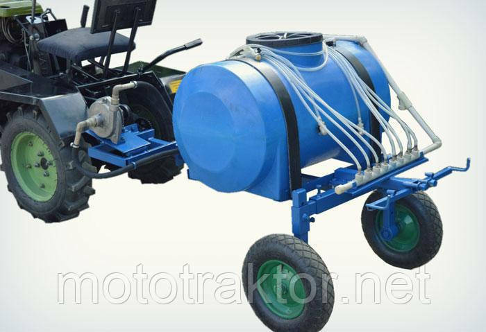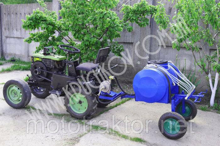 Опрыскиватель подсоединяется к навесному (прицепному) механизму мототрактора.