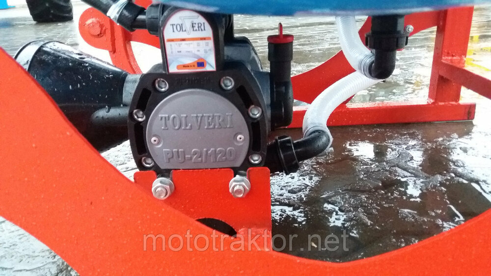На данных опрыскивателях установлен качественный пластмассово-чугунный насосы фирмы "Tolveri" мембранно-поршневого типа, способный прогонять через себя жидкость до 120 литров в минуту. Выдерживает любые растворы, от мягких удобрений, до агрессивных инсектицидов. Прост в обслуживании и надежен в работе. Гарантия на насос 1 год.