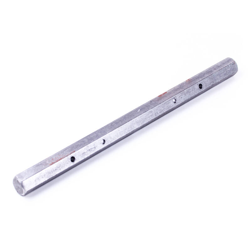 Ось колес шестигранная ТАТА на КПП, L-500 мм предназначена для интеграции с моторами 178F и 186F, работающими на дизельном топливе, в совместной системе с КПП, включающей две передачи вперед и одну назад. Запчасть является важной составной частью трансмиссии, ответственной за передачу вращательного момента от коробки передач к колесам мотоблока. Деталь представляет собой цельнокатаный металлический стержень с шестигранной формой сечения. Для надежной фиксации в коробке передач на одной из шести граней изделия предусмотрены специальные углубления под стопорные компоненты. В конструкции присутствуют сквозные отверстия, предназначенные для установки и крепления ступиц колес в определенном положении. Использование высококачественного материала обеспечивает детали необходимую прочность и способность выдерживать повышенные нагрузки в процессе работы техники.