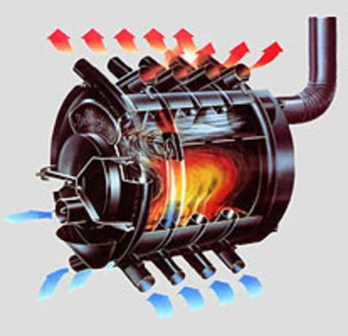 Печка Булерьян производства МЧП "ВИТ" - стальная цельносварная конструкция, по бокам опоясанная множеством труб. Это оригинальный Булерьян, который изготавливается из котловой стали; труба цельная - без шва в середине. Нижние патрубки втягивают с пола холодный воздух. Эти трубы прижаты к топке печи, за счет этого сразу происходит теплообмен и воздух прогревается до 100-120 °C. Выходя из верхних патрубков, нагретые потоки равномерно распределяются в помещении.