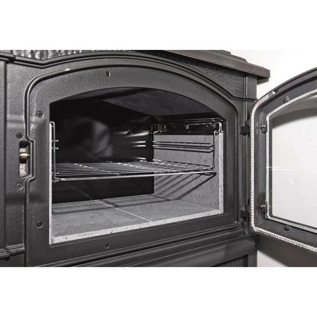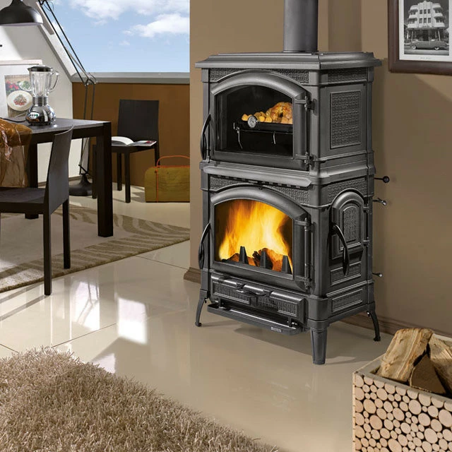 Печь-камин La Nordica Isotta forno поможет сделать интересный акцент в интерьере и создать поистине домашний уют. Конструкция печи La Nordica Isotta forno выполнена из высокопрочного чугуна, а эмалированное покрытие значительно увеличивает продолжительность эксплуатации. К тому же печь-камин La Nordica Isotta forno оснащена духовкой с термометром, поэтому приготовления пищи на ней будет, происходит легко и эффективно. Подача воздуха двухуровневая. Высокое значение КПД в 83,1% и режим длительного горения продолжительностью в 12 часов реализуются за счёт вторичного дожига газов. Игра пламени доступна для обозрения благодаря устойчивой к температуре не более 750 градусов стеклокерамике. Поверхность стекла печи-камина La Nordica Isotta forno всегда остаётся максимально прозрачной и обеспечивает отличный вид на пламя, её чистота поддерживается автоматически (циркуляция воздуха). Зольный ящик обладает достаточной подвижностью и аккумулирует все продукты горения, что сокращает временные затраты на поддержание чистоты отапливаемого помещения. Печь-камин La Nordica Isotta forno имеет высокую номинальную мощность в 11, 5 кВт, что обеспечивает обогрев помещения с размером не более 110 м2. Подключение к дымоходу в двух направлениях – заднем и верхнем для облегчения монтажных работ. Есть возможность дополнительно установить шиберную заслонку, значительно повышающую силу пламени и напольное покрытие в виде листа. Функционирование печи-камина La Nordica Isotta forno идёт за счёт сгорания дров, среднее количество топлива необходимого на час работы составляет 3,2 килограмма. Закладка дров осуществляется сбоку при помощи специальной дверцы, это повышает безопасность эксплуатации изделия. Агрегат имеет декоративные чугунные элементы и классический чёрный цвет, создающий неповторимый внешний вид печи-камина.