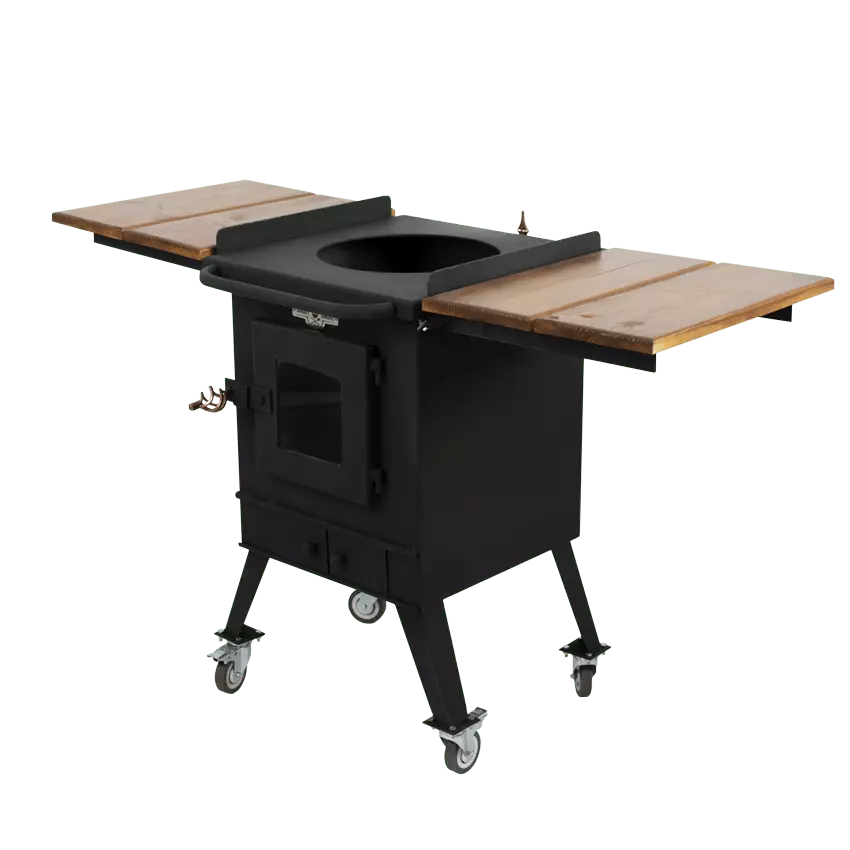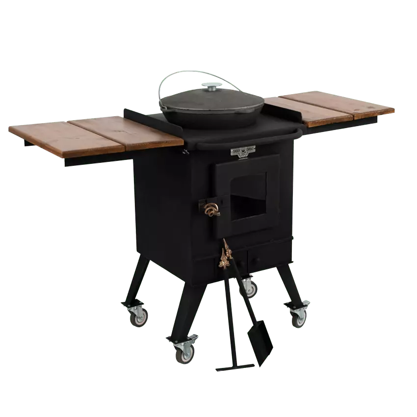 Для удобства, по бокам расположены две деревянные полки, предназначенные для подготовки продуктов, посуды или специй. В нижней части жаровни находится отверстие для удаления золы. Наличие колес и удобной ручки позволяет ее без труда транспортировать к месту готовки.