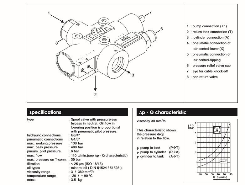 - напор до 220 л / мин - ограничивает падение давления в направлении от насоса к цилиндру, от насоса к масляному резервуара и от цилиндра к масляному резервуара. Падение давления может нанести повреждений насоса, шланга или уменьшить рабочий ресурс системы. Высокое значение разрешенного напора масла уменьшает время разгрузки, что имеет важное значение для пользователя. Уменьшение времени разгрузки не только увеличивает эффективность использования транспортного средства, но и минимизирует время опасной работы, связанной с поднятием и опусканием перекидного корпуса. Во время разгрузки, возможна опасность потери устойчивости транспортного средства, например, через неравенство почвы, или сильный боковой ветер