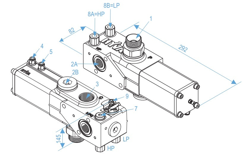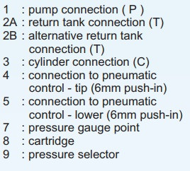 - патроны для настройки максимального рабочего давления. Типичные клапаны оборудованы зажимными винтами, которые регулируют максимальное рабочее давление. Водители часто регулируют давление, для увеличения подъемной силы цилиндра (перегрузки). В результате цилиндр может получить повреждения. Клапаны PT имеют сменные патроны максимального давления, с заводской установкой на определенное давление, нерегулируемые. Для изменения максимального давления, необходимо заменить патроны.