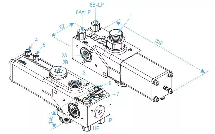 - патроны для настройки максимального рабочего давления. Типичные клапаны оборудованы зажимными винтами, которые регулируют максимальное рабочее давление. Водители часто регулируют давление, для увеличения подъемной силы цилиндра (перегрузки). В результате цилиндр может получить повреждения. Клапаны PT имеют сменные патроны максимального давления, с заводской установкой на определенное давление, нерегулируемые. Для изменения максимального давления, необходимо заменить патроны.