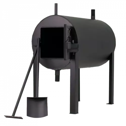 Топка булер'яна досить містка і виготовлена із труби товщиною 5мм. Це забезпечує безперервну роботу протягом 5-8 годин. Інтенсивність горіння і, відповідно, час роботи печі регулюється шиберними заслінками. ВстановленІ вони на патрубку подачі кисню та на димохідному патрубку.