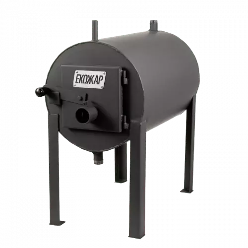 У приміщеннях, де є можливість встановити радіатори опалення, використовують буржуйку з водяним контуром Екожар КВД 200. Теплоносієм виступає вода, нагрівання якої відбувається в порожнині між топкою печі та зовнішнім кожухом. Передача прогрітої води від буржуйки до радіаторів здійснюється з допомогою циркуляційного насоса. Для контролю рівня нагрівання води зроблено посадкове місце під градусник. Розмір патрубків для підключення водного контуру - ¾ дюйма і може бути змінений на індивідуальне замовлення.