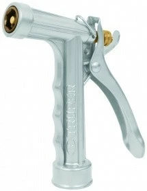 Выделяют 2 основных типа поливочных пистолетов: с распылителем или с наконечником. Модели с распылителем являются многофункциональными. Они могут работать в различных режимах: душ, центральный, проливной дождь, туман, угловой, конический, плоский, полный, проливной дождь. Данные режимы различаются видом и интенсивностью распыления струи воды. В поливочных пистолетах с наконечниками предусмотрена возможность полива с плавной регулировкой потока воды.
