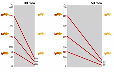 Super isol, Silca обладает очень низкой теплопроводностью. При нагреве плиты толщиной 30 мм, внешняя сторона прогревается в следующей прогрессии внутри → снаружи: