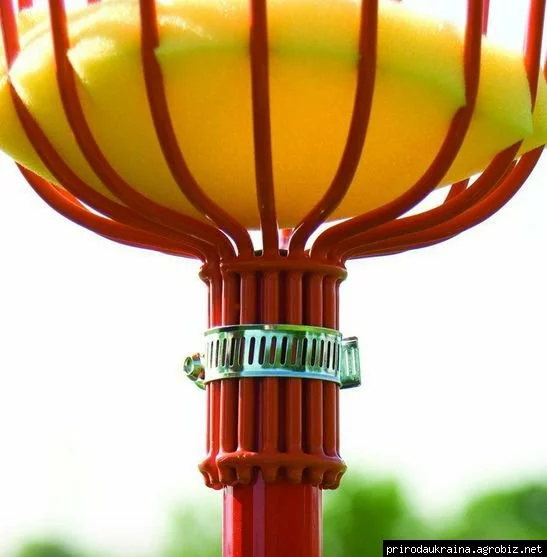 Плодосъемник Truper  металлический, большого объема (2л) ,имеет "когти" для обрывания фрукта, мягкий поролон внутри корзины. Удобно и рочно закрепляется на штанге хомутом на винте.