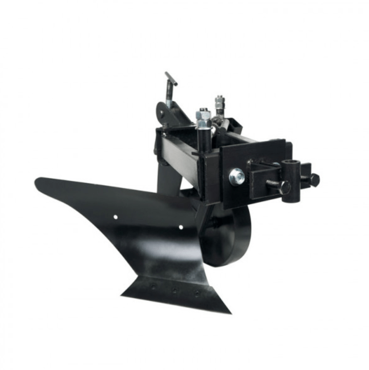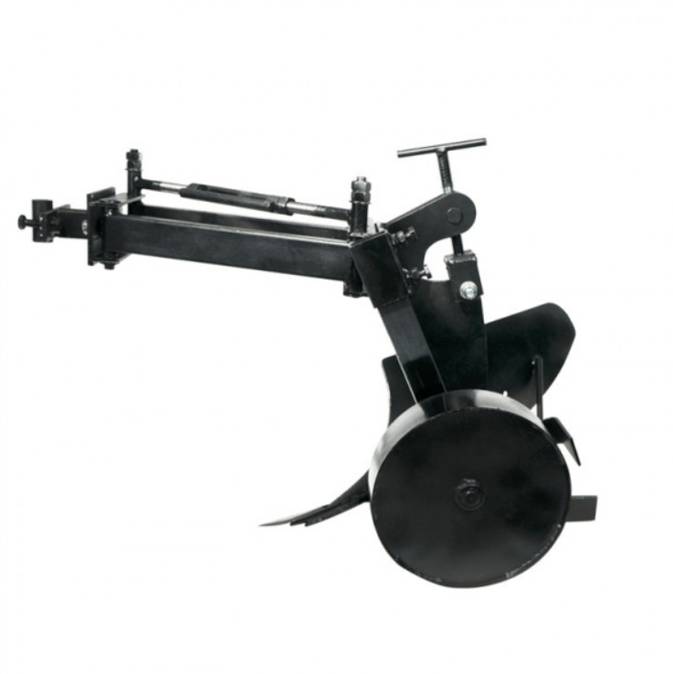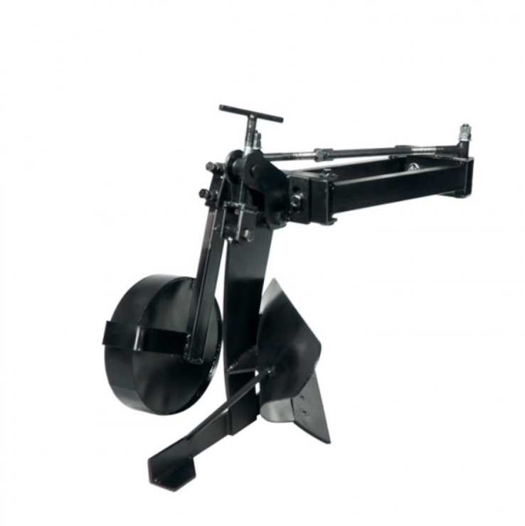 Основой конструкции выступает укороченная рама с подвижным параллелограммом. Такой механизм позволяет смещать корпус плуга по отношению к оси мотоблока без изменения его углового положения. Это решение обеспечивает стабильную глубину вспашки, равномерный захват грунта и предотвращает боковые усилия во время работы. Благодаря регулировочной тяге, пользователь может точно настроить положение плуга в соответствии с типом грунта или требуемым уголом атаки.