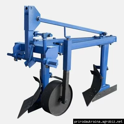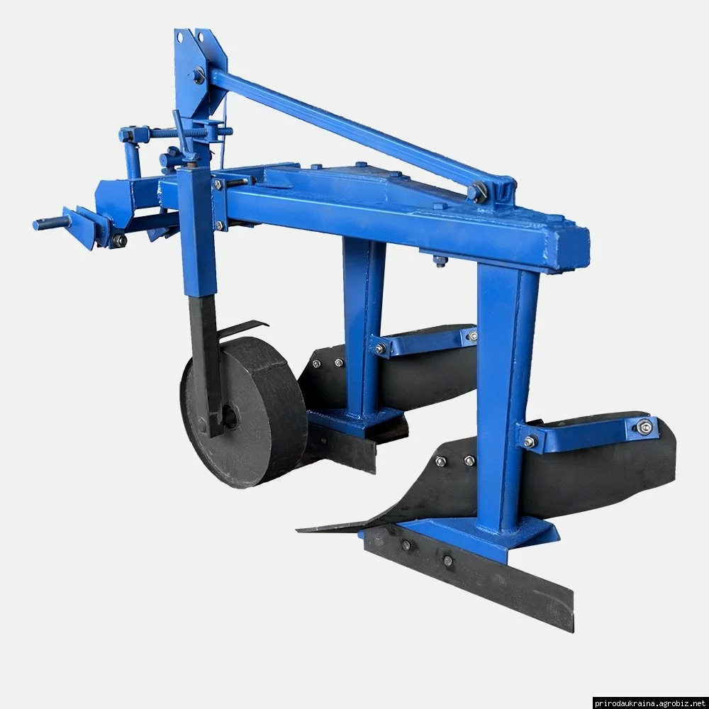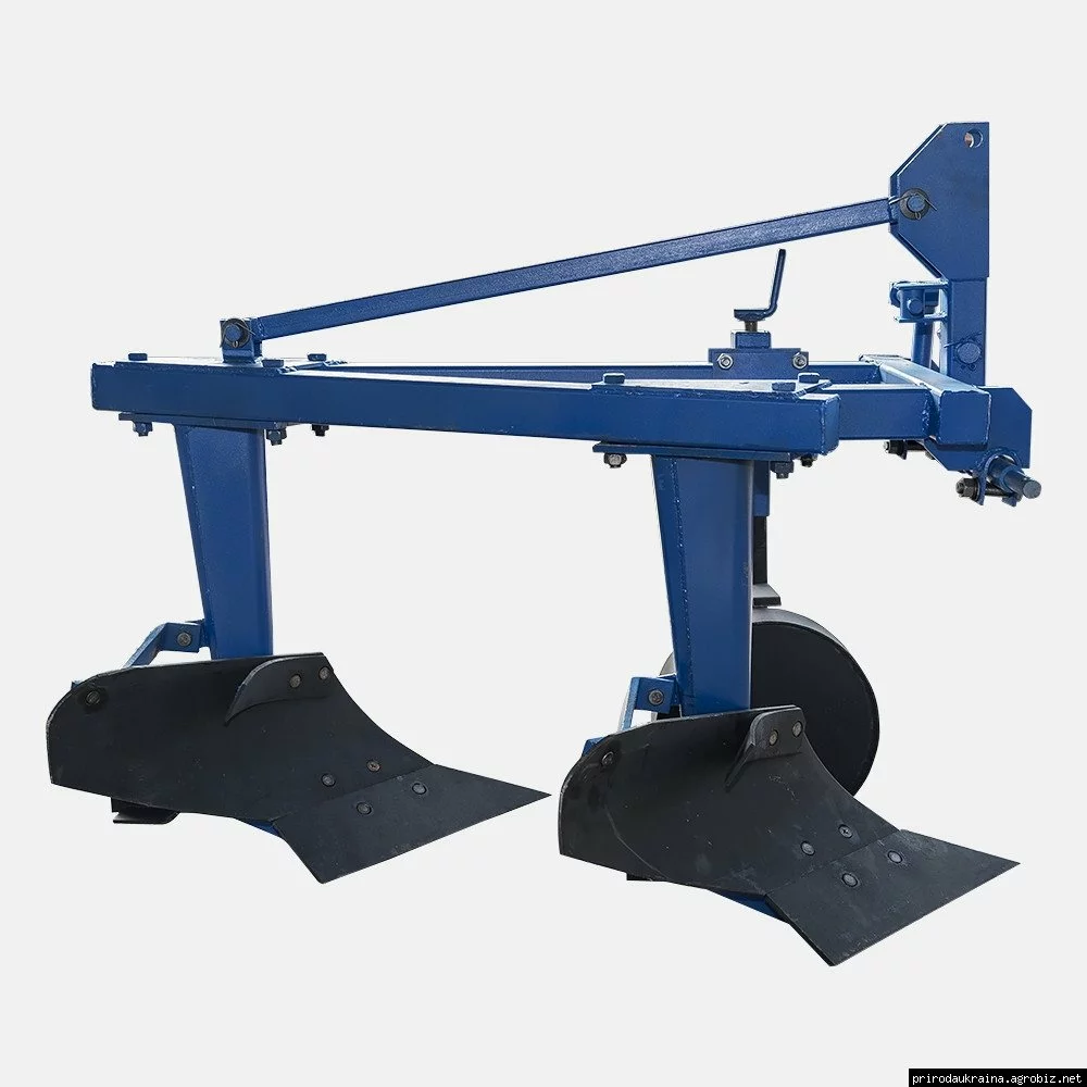 Двухкорпусный усиленный плуг для основной вспашки с полным поворотом пласта.Лемех удлиненный, отвал увеличенный с задней опорой и дополнительным стерневым отвальчиком для поворота пласта.Полевые доски удлиненные. Стойка и рама усиленная из сварной трубы трехточечного крепления. Глубина вспашки регулируется опорным колесом с помощью винта. Дополнительными винтами производится точная регулировка.