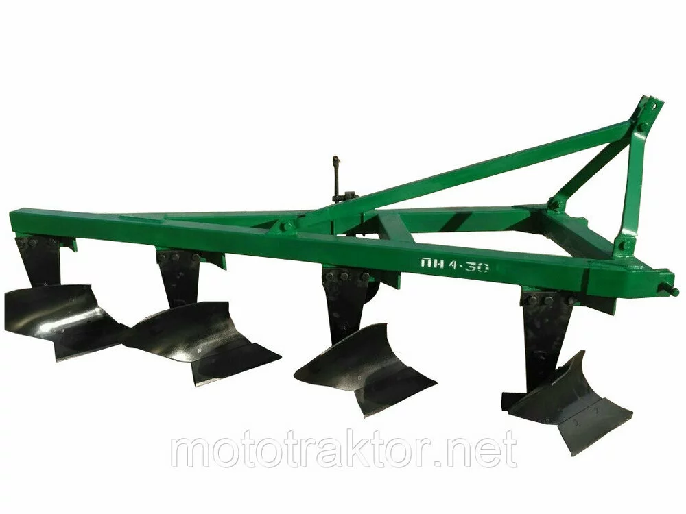 ПН-4-30 изготовлен из квадратного профиля марки стали высокого класса, имеет усиленные сварные швы и изностойкую покраску. Крепление данного плуга под трехточечную навесную систему для трактора или минитрактора. Конструкция позволяет эффективно использовать плуг для целевых назначений.