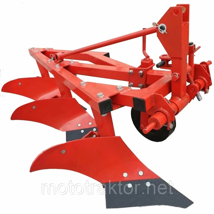Количество корпусов - 3 шт, ширина захвата плуга составляет 800 мм, глубина обработки - 250 мм. Конструкцией предусмотрена регулировка наклона, поворота право-влево. Ножи изготовлены из кованого металла. Рама плуга - утолщенная.