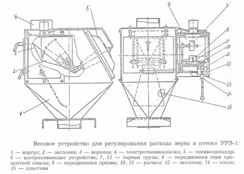 Устройство расхода зерна — весовой дозатор суммарного учета предназначено для обеспечения заданного расхода зерна с целью получения зерносмеси с определенным процентным отношением компонентов на мельницах сортового помола, а также для измерения средней производительности и регулирования расхода зерна зерноочистительных агрегатов и зерносушильных комплексов послеуборочной обработки зерна. Дозируемые продукты: зерно пшеницы, ржи и ячменя насыпной массой о,65 – 0,85 т/м3. Принцип действия устройства: зерно, пройдя через впускную воронку, падает на наклонную пластину и отклоняет её из исходного положения. Сила, вызывающая отклонение пластины, пропорциональна расходу зерна, проходящему через воронку. Эта сила уравновешивается массой передвижной гири, положение которой устанавливается при регулировке.