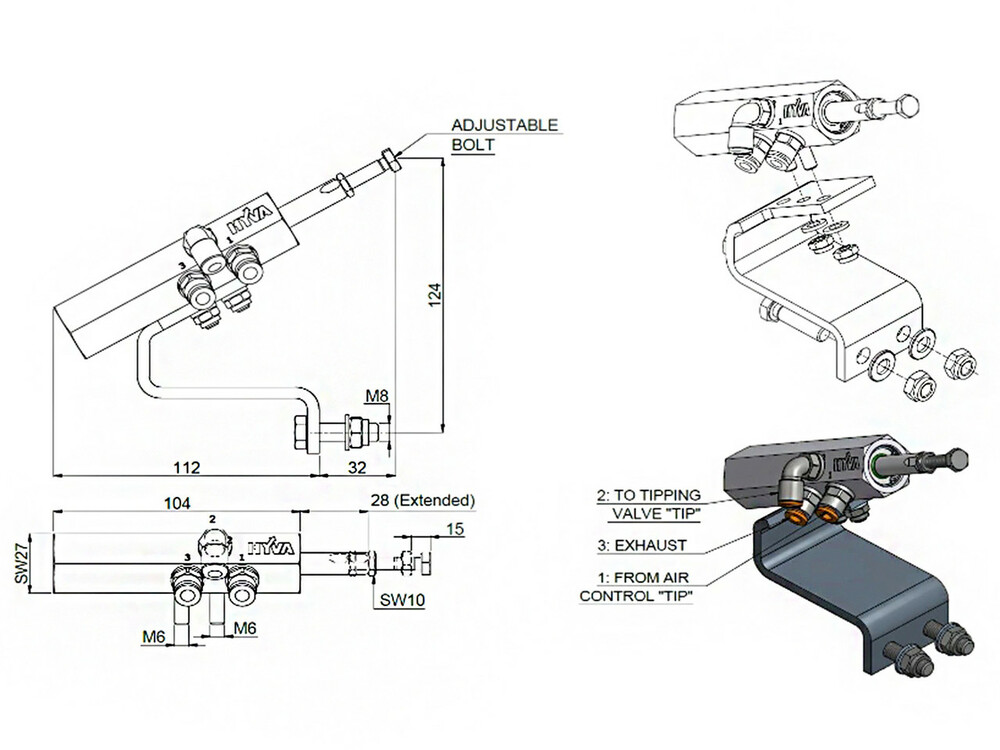 Управление пневматическим ограничителем совершается при помощи наклона рычага в любую сторону. Данный ограничитель хода применяется для работы самосвальных систем с трехсторонней разгрузкой.