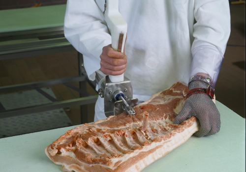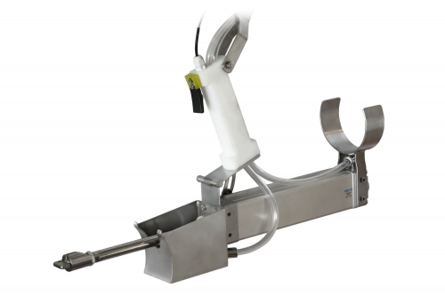 Пневматическое устройство для извлечения ребра, питание электрическое. Аппарат выполнен полностью из коррозионно-стойких материалов и одобрен для использования в производстве пищевых продуктов. Использован пневмопривод DZH – 40 FESTO. Работает при подключении к сети (230В) и сжатого воздуха. Устройство позволяет извлекать ребра с минимальной потерей веса мяса. Это делает работу легче и ускоряет процесс резки ребра. Технические характеристики: Мощность: Электрический, 230 Размер: 460 мм / 140 мм / 380 мм Вес: 3,2 кг Используемый привод: FESTO DZH 40 Ход поршня: 200 мм Клапан: электромагнитный FESTO компактное исполнение 24V DC Источники питания: электрика Напряжение: 220 - 240 В переменного тока Частотность : 50 – 60 Hz Предохранитель: 1 А / 250 В Пневматическое питание Необходимое давление воздуха: 6 бар, воздух чистый и сухой Минимальное потребление воздуха: 2,5 литра при полном движении поршневого штока Тип датчика: Kontaktron SATEL Рабочие параметры Время одного полного движения: 0,25 секунд Средняя скорость движения поршня во время движения: 1,0 м / с Максимальная скорость движения поршня во время движения: 1,2 м / с