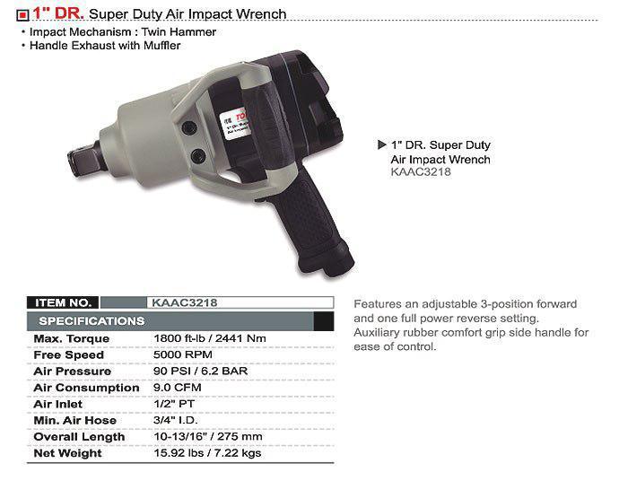 Пневмогайковерт TOPTUL KAAC3218 1" принадлежит к классу мощных ударных пневматических инструментов. Корпус гайковерта выполнен из композитного материала и весит 7,22кг. Пневмогайковерт выполнен с двумя ручками для простоты управления. А так же для комфортной работы и безопасности мастера кнопка пуска спрятана во внутреннюю часть рукоятки, что бы при длительной работе пневмогайковерт не выскальзывал с рук, рукоятки прорезинены. Максимальное усилие создаваемое пневматическим гайковертом составляет 2441 Н/м, а расход воздуха 255 л/мин.