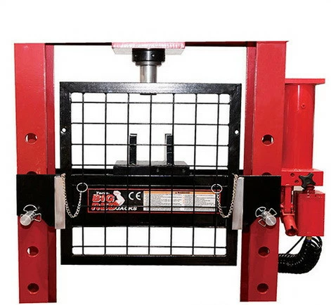 Также вертикальный гидравлический пресс оборудован защитной рамой, для гарантирования полной безопасности оператора-механика. В манометр гидравлического пресса залит специальный морозоустойчивый гель (до -5°C), для плавности хода стрелки. Пневмопривод подается при нажатии ножной педали, что способствует облегчению труда оператора.