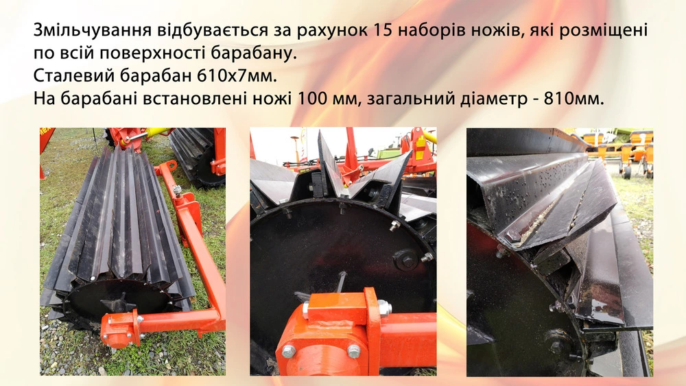На барабані подрібнювача розташовано 15 наборів ножів. Розміри сталевого барабана 610х7мм. На ньому встановлені ножі 100мм, загальний діаметр 810мм.