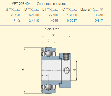 Подшипник шариковый дюймовый Claas 561299.0 аналог YET206-104