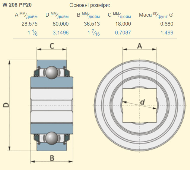 Подшипник с квадратным отверстием Massey Ferguson 1025130M1 аналог W208PPB6