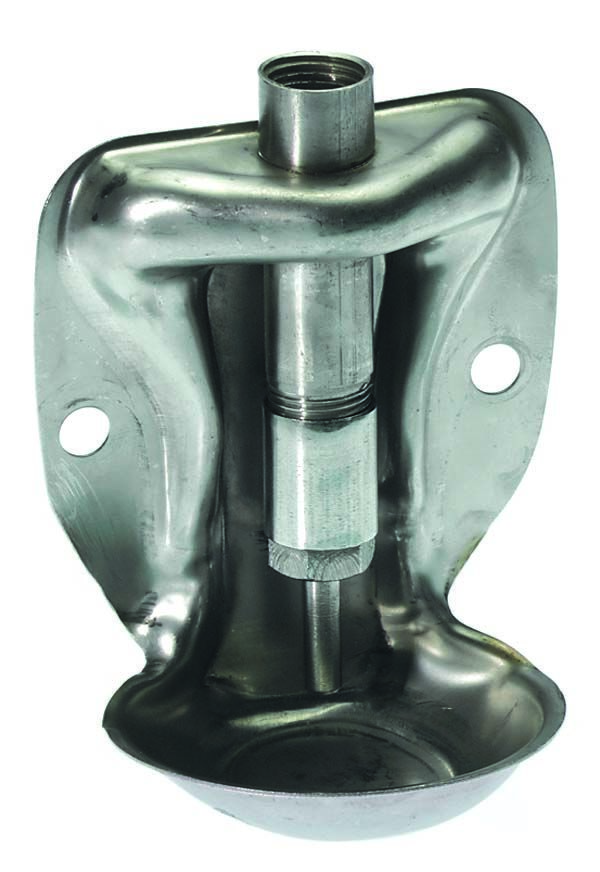 Чашечная поилка для поросят, устанавливаемая в станок для опороса. Изготовлена из нержавеющей стали, с отверстием с внутрутренней резьбой 1,27 см.