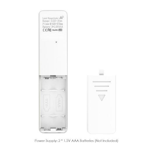 Питание лазерной рулетки обеспечивают две батарейки типоразмера ААА. Одного комплекта хватает на 3000 измерений. Для продления срока службы элементов питания предусмотрена функция автоматического отключения дальномера.