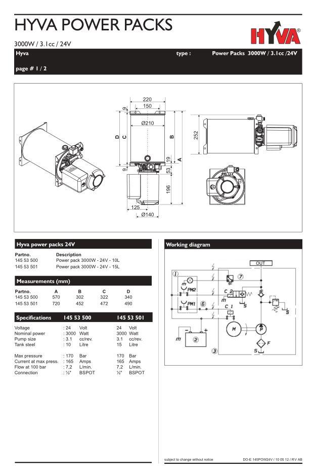 Гидравлическая маслостанция Hyva 14553501 предназначена для небольших самосвалов и других автомобилей до 3 тонн, работающих на 24 вольта. Эта станция, оснащенная мотором мощностью 3,0 кВт и насосом производительностью 3,1 см3/об, идеально подходит для применения в полуприцепах и прицепах. Hyva обеспечивает надежную и эффективную работу гидравлической системы, позволяя выполнять подъем и опускание кузова самосвалов с высокой точностью и стабильностью. В комплект входит ограничитель подъёма кузова (knock-off). Направление вращения мотора: правое (CW – clockwise).