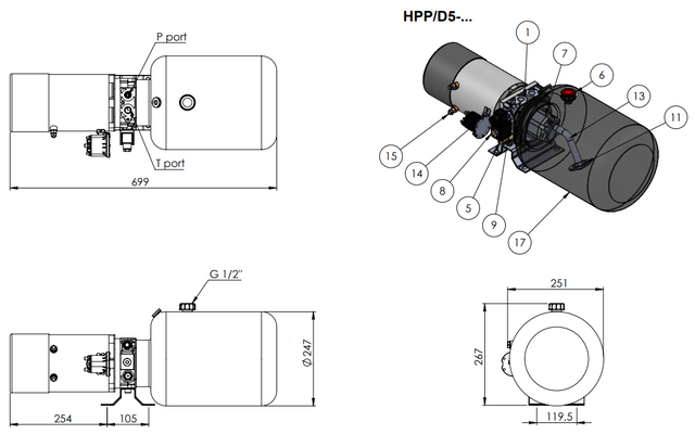 Мини-маслостанция HYDRO-PACK HPP/D5-6097 предназначена для работы с подъемом кузова. Она оснащена электромотором мощностью 4.5 кВт и работает при напряжении 24 В DC, скорость вращения 2000 об/мин, максимальное рабочее давление до 230 бар. Насос станции имеет рабочий объем 3.2 см3/об. Масляный бак объемом 15 литра выполнен из стали и имеет цилиндрическую форму. Устройство устанавливается в горизонтальном положении.