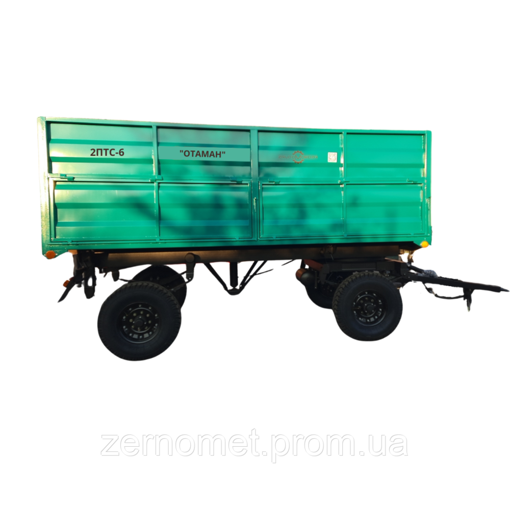 Причіп тракторний самосвальний двосний 2ПТС-6 "ОТАМАН".                                        Для перевезення сільськогосподарських і будівельних вантажів незамінним помічником стане тракторний причіп 2ПТС-6 із надставними бортами. Це багатофункційний транспортний засіб, який підходить для експлуатації в польових умовах або на дорогах загального користування.