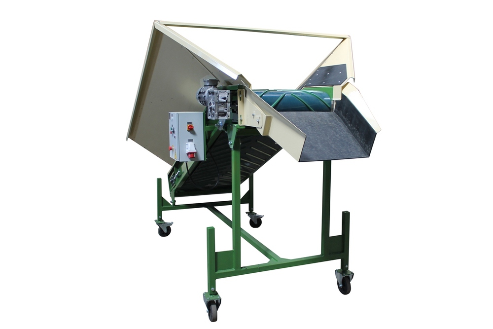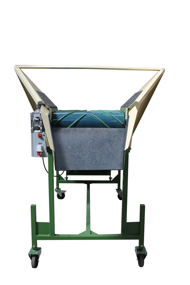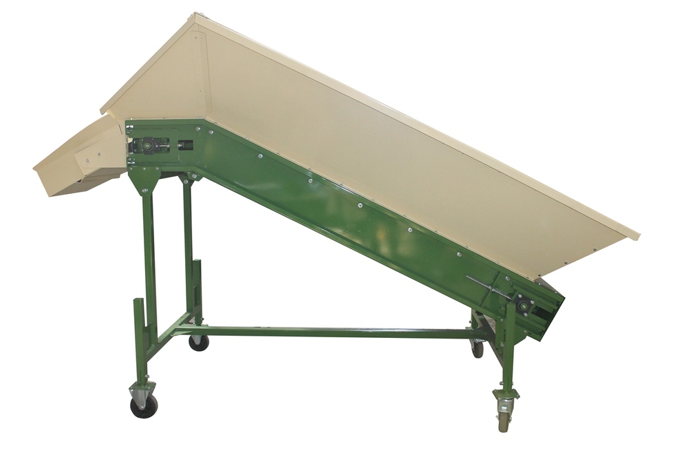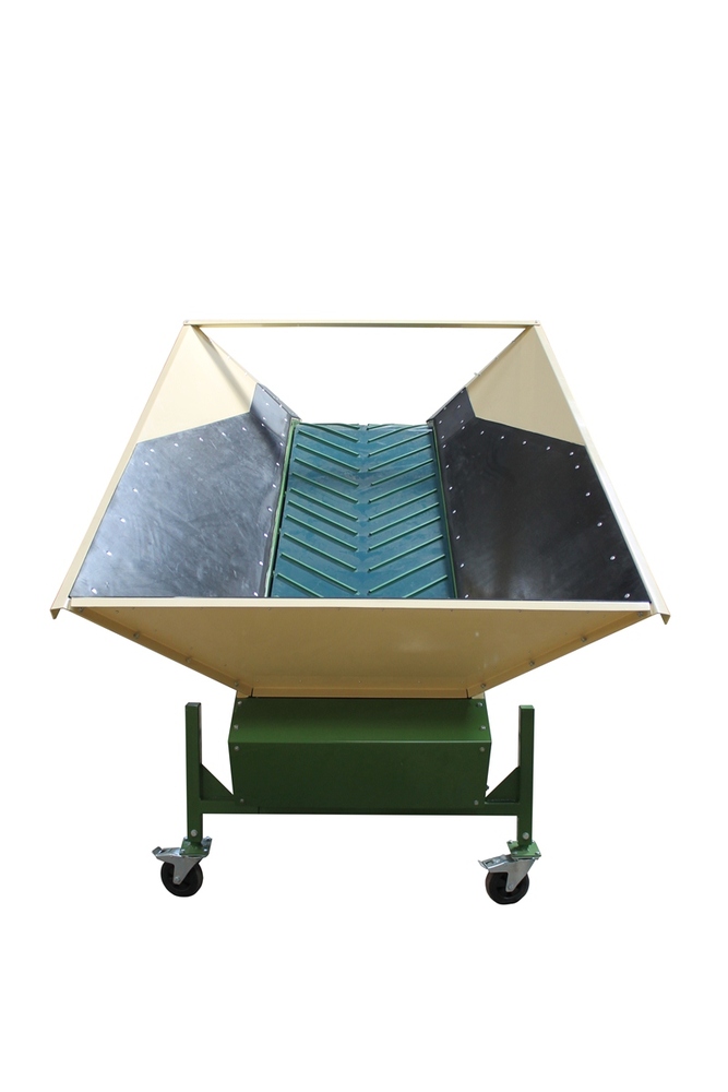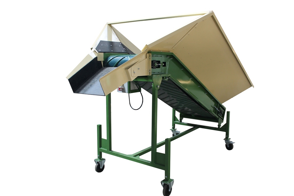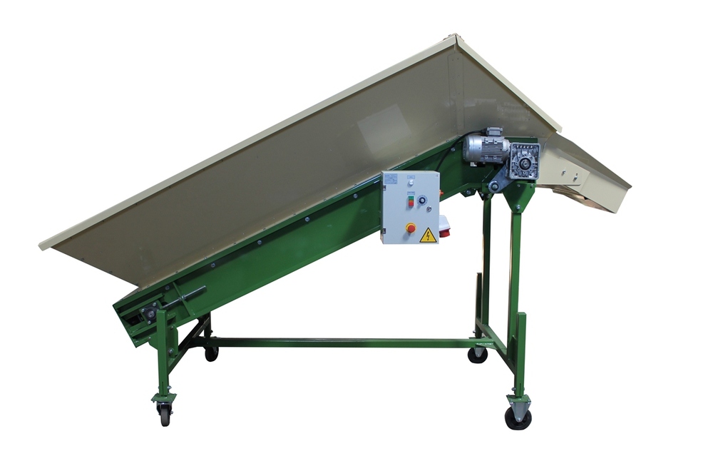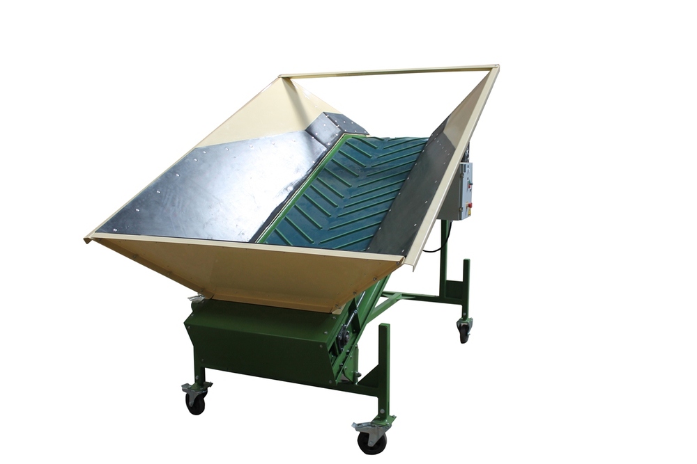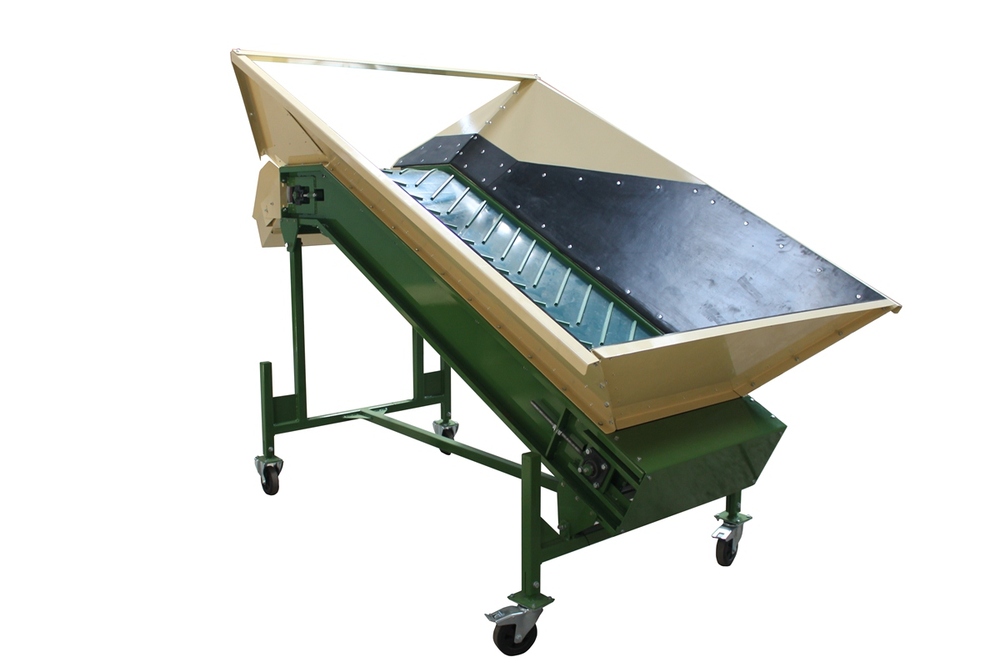 приемный бункер для овощей и картофеля КЛП-1 (накопительный бункер) - предназначен для приёма овощей, картофеля, моркови, лука, свеклы, корнеплодов и равномерной и непрерывной подачи их далее по технологическому циклу-линии. Приемный бункер устанавливается перед установки для мойки овощей УМ-10, установки сухой очистки УСО-10, сортировочным инспекционный столом КРИ-10, установки калибровочной УК-10 и т.д. На приемном бункере установлен частотный преобразователь для регулировки скорости движения ленты (регулировка производительности). Приемный бункер используется к опрокидывателю контейнеров, под ручную загрузку с сеток и под навальное хранение.