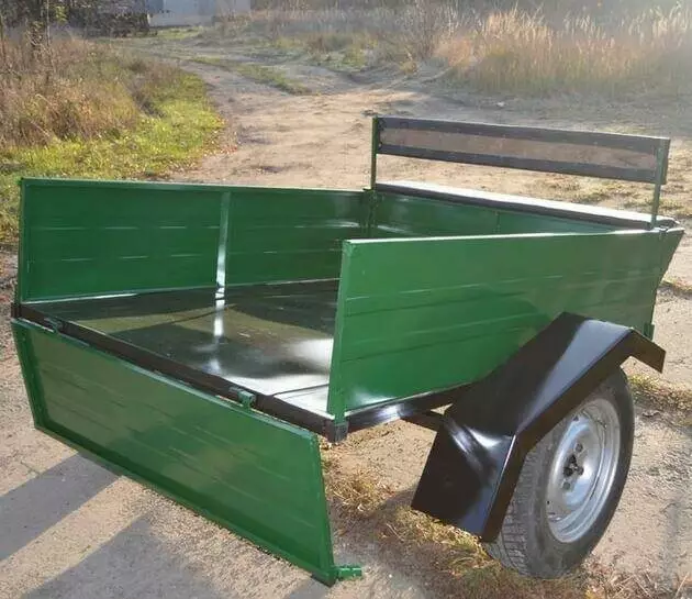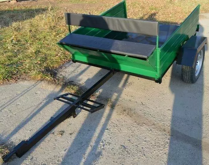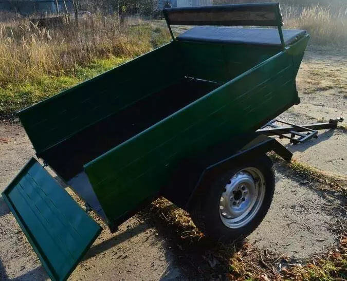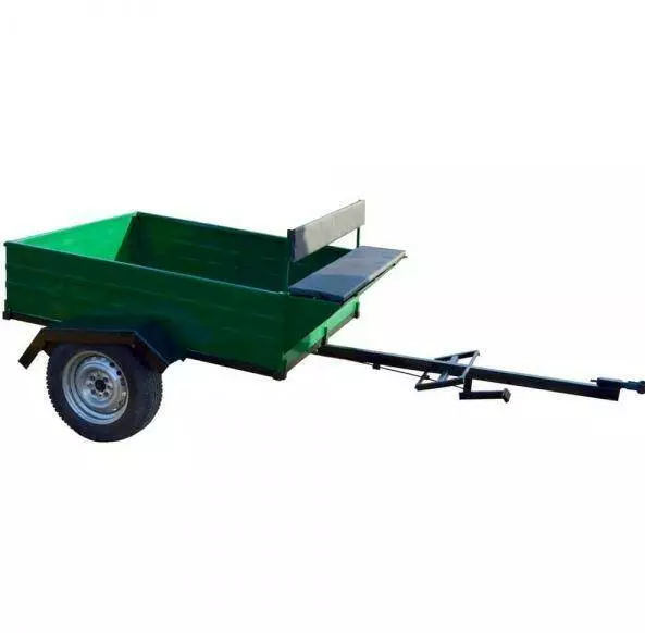 Бункер под инструменты, сидушка на два человека. Задний борт откидывающийся на защелках. Все борта съемные. Усиленная сцепка. Ленточный тормоз.