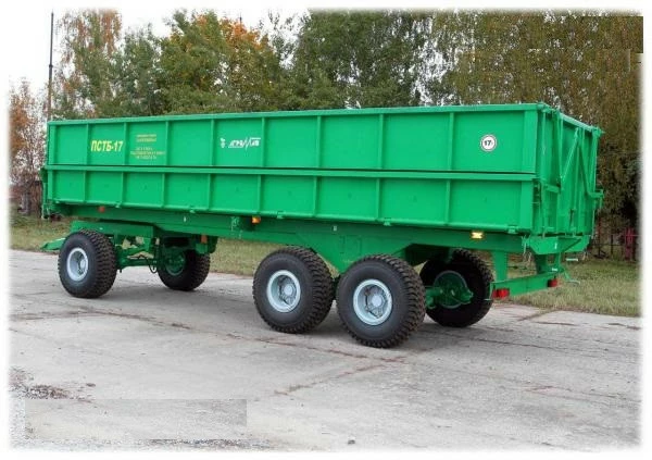 Прицеп самосвальный ПСТБ-17 предназначен для транспортировки различных сельскохозяйственных грузов, зерна, корнеплодов с разгрузкой на боковые стороны. Ходовая система прицепа состоит из балансирной тележки и переднего моста, соединяемого с шасси через поворотное устройство. Управление всеми механизмами с системами прицепа, кроме стояночного тормоза, стопорения кузова и фиксаторов бортов, осуществляется трактористом из кабины трактора.