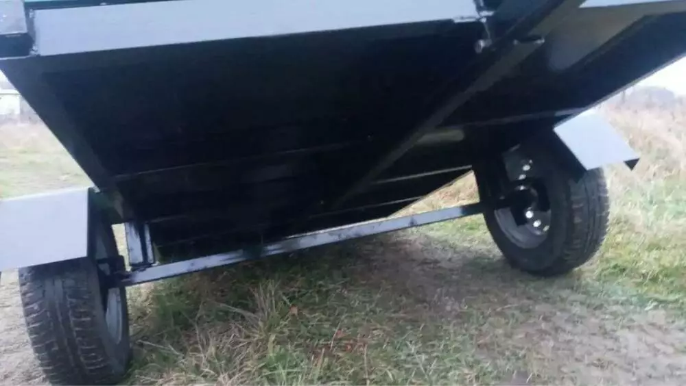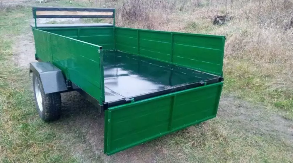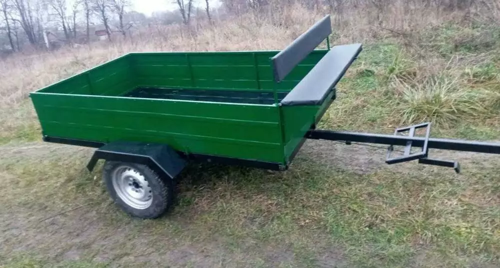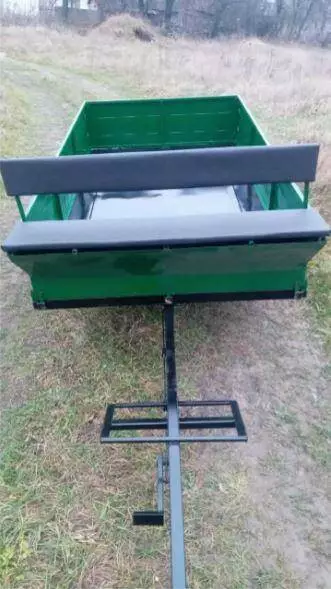 Бункер под инструменты, сидушка на два человека. Задний борт откидывающийся на защелках. Все борта съемные. Усиленная сцепка. Ленточный тормоз.