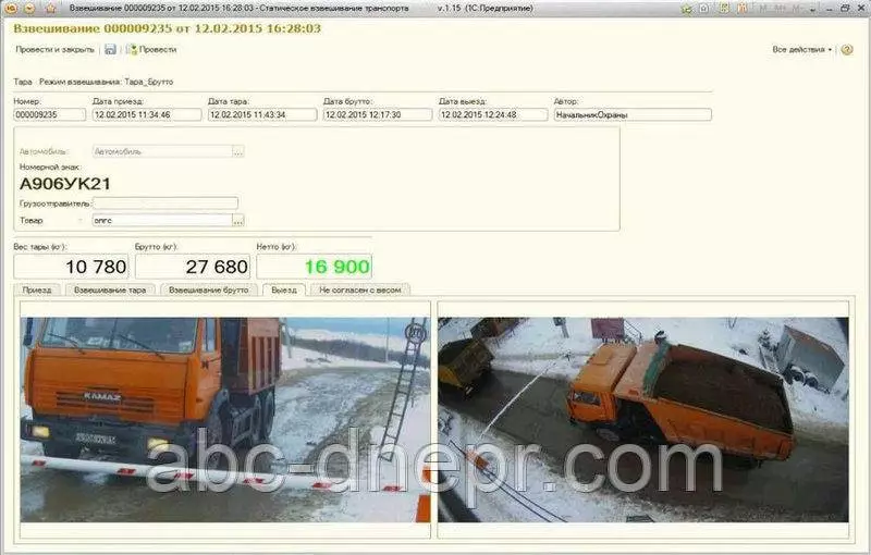 Если Вы до этого приняли на учёт автомобиль без груза, то при данной операции Вам необходимо считать при помощи кнопки "Взвесить", вес БРУТТО автомобиля, который прибыл на весовую без груза.